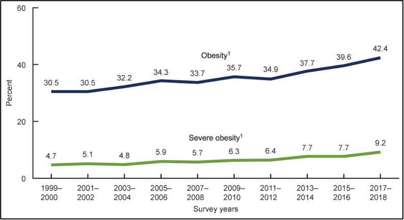 The presence of obesity is increasing in the United States. As patients with obesity experience higher rates of morbidity and mortality on average, this is a concern for the healthcare system. From 1999 – 2000 through 2017 – 2018, the US obesity prevalence increased from 30.5% to 42.4% (Figure 2).