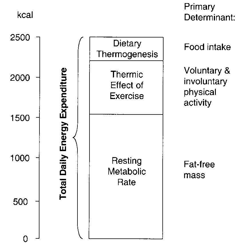 Energy balance is achieved when there is stability between energy intake (calories consumed) and energy expenditure (calories burned). Total daily energy expenditure (Figure 1) is composed of resting metabolic rate (RMR), thermic effect of exercise (TEF), and dietary thermogenesis. The RMR is the energy expenditure required for maintaining normal body functions and homeostasis (the minimal ongoing energy utilization required to sustain cardiac activity, respiration, neurological function, and all the metabolic activities of bodily tissues). The RMR is influenced by multiple factors including body size, age, growth, gender, hormonal systems (e.g. thyroid), infection, physical activity, medications, drugs and dietary deficiency. The RMR is proportional to body mass, in particular fat-free mass. The larger the body size, the higher the RMR will be (proportional to body mass). Resting metabolic rate accounts for 50-75% of total energy expenditure. TEF (thermic effect of food aka dietary thermogenesis) refers to the energy required to absorb, digest, and metabolize the food consumed and typically accounts for 8–10 % of daily energy expenditure. Diet-induced thermogenesis comprises energy expenditure by digestion, absorption, and storage of food and can be affected by the type of food ingested. For example, meals with high protein or carbohydrate content increase diet-induced thermogenesis more than do meals high in fat. The energy expended due to physical activity (EEact) accounts for energy that is expended in addition to the RMR and TEF, including voluntary exercise, shivering, postural control, and voluntary movement. When energy levels are in balance, body weight is stable. One effect of changes in energy balance may be a change in body weight and/or composition. The body also regulates RMR, appetite, sleep, and activity to keep body weight and energy balance stable.