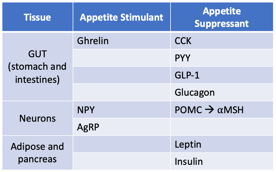 The presence of nutrients in the gut leads to secretion of acute onset hormonal signals that inform the body of nutritional status. The intestine and stomach secrete hormonal signals that feedback to the hypothalamus to control meal initiation or termination. Cholecystokinin (CCK) is secreted from the I-cells of the GI tract (duodenum) in response to lipid and protein intake. CCK is a neuropeptide and gut hormone that leads to release of digestive enzymes and bile from the pancreas and gallbladder, slows gastric emptying (thus increasing satiety) and signals to the hypothalamus to increase satiety. Peptide YY (PYY) is synthesized and released from enteroendocrine cells called L-cells found in the distal GI tract (ileum and colon). PYY concentration increases after a meal and decreases with fasting. PYY inhibits gastric motility (thus increasing satiety) and acts centrally to suppress activation of neurotransmitters NPY and AgRP. Fibroblast growth factor 19 (FGF19) is a gut hormone with pleiotropic effects. It is secreted by the small intestinal cells in response to feeding and inhibits food intake. Glucagon-like peptide 1 (GLP-1) is a hormone that will be discussed in more detail in the diabetes lecture (part 1). It is secreted by the L-cells of the distal intestine (ileum and colon) and delays gastric emptying and acts centrally to suppress AgRP/NPY. GLP-1 also controls blood glucose by enhancing glucose-dependent insulin release and decreasing hepatic glucose output (more on this in the diabetes chapter). Unlike PYY, GLP-1, and CCK which all lead to appetite suppression by several mechanisms, ghrelin is a gut-derived hormone that leads to appetite increase. Ghrelin is secreted by enteroendocrine cells of the GI tract (especially the stomach). Blood levels of ghrelin are highest before meals when the stomach is empty and return to lower levels after mealtime. Ghrelin activates NPY and AgRP neurons, leading to appetite stimulation. Ghrelin also acts in the anterior pituitary gland to increase growth hormone secretion.