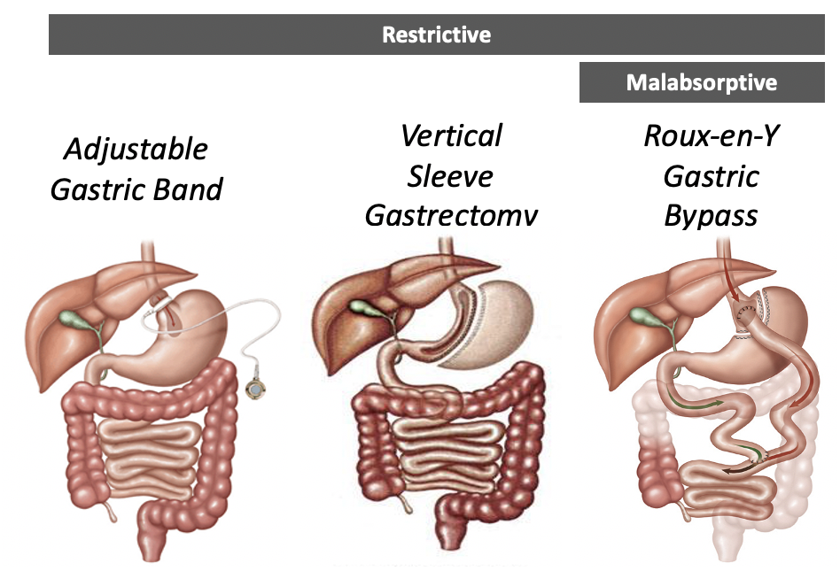 Malabsorptive surgeries alter the flow of nutrients and biliopancreatic enzymes in the GI tract due to the surgical alteration of the intestines. This decreases the functional length and area of absorption of the intestines. The most common procedure world-wide is the Roux-en-Y gastric bypass procedure, which combines a restrictive procedure, reducing the stomach to a 30 ml pouch, and malabsorptive procedure, attaching the stomach to the jejunum and bypassing the lower stomach and duodenum. The biliopancreatic diversion with duodenal switch is the most effective bariatric operation and offers greater magnitude of diabetes remission and weight loss, but due to the significant malabsorption this is not commonly performed. Figure 4 demonstrates the three most used bariatric surgery procedures.