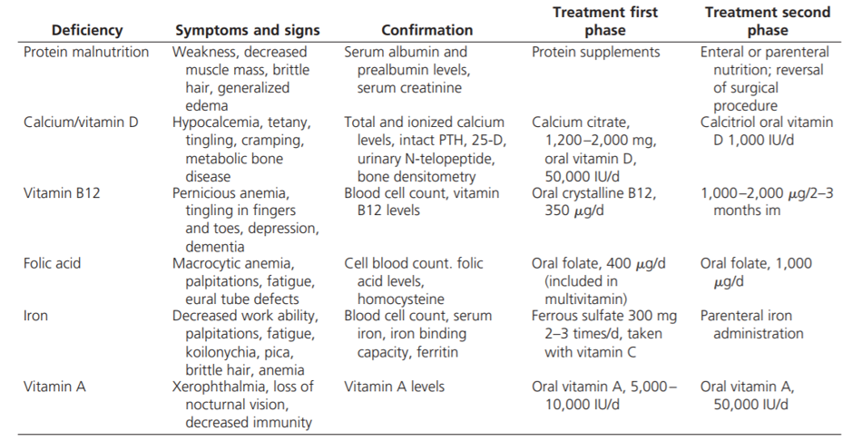 It is important to be aware of how the altered anatomy of bariatric surgery will have implications on a patient’s routine care. In addition to complications from the surgery itself, the altered anatomy with the malabsorptive procedures can lead to multiple nutritional deficiencies. The absorption of calcium, iron, fat soluble, and B-complex vitamins are all decreased and require lifelong supplementation. Malabsorption can also lead to protein deficiency. Post-operative care following bariatric surgery requires routine follow up with monitoring for possible complications (Table 5).