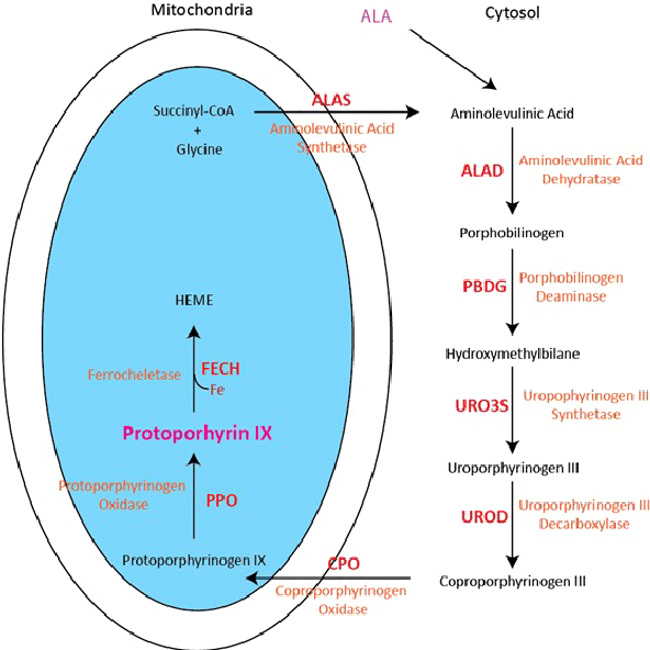 - Porphyrias: Porphyrias are a group of disorders with various clinical symptoms that are due to defects in specific heme biosynthetic enzymes. Each different porphyria results from a defect in one of the specific heme biosynthesis enzymes. This causes products (intermediates) in the heme biosynthesis pathway to accumulate in the cells, and this can lead to certain disorders.