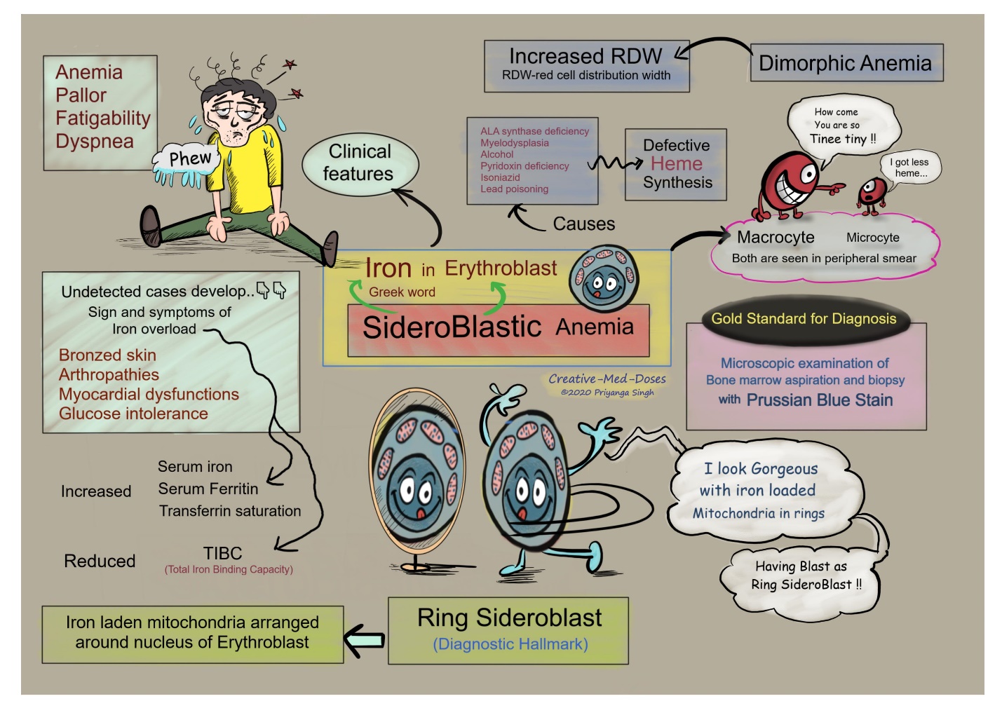 - X-linked sideroblastic anemia: This is a congenital anemia, X-linked recessive, that is due to mutations in ALA-S2, an erythroid-specific isoform of the first enzymes in the heme synthetic pathway. Vitamin B6 is a cofactor for ALA-S2, and hence B6 supplements can be helpful. The Anemia is labelled Sideroblastic because impaired heme synthesis leads to presence of iron granules around the nucleus of red blood cell precursors, presumably because the iron can’t be incorporated into the heme moiety due to the mutation. Cells with iron granules around them can be seen with a certain stain on bone marrow, and these are called “ringed sideroblasts”. Ringed sideroblasts are seen in other certain types of anemia, but are certainly present in this type, hence the name.