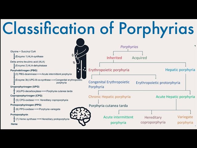 - Mixed neurovisceral symptom and photocutaneous symptom prophyrias: Hereditary Coproporphyria, Variegate Porphyria.