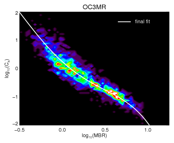 After correction for atmospheric effects, the algorithm identifies a maximum band ratio (MBR), the largest ratio of intensity at several possible blue wavelengths divided by intensity at a green wavelength. Then, a nonlinear fit (specific for each satellite) is made between the MBR and available in-situ chlorophyll-a concentration data.