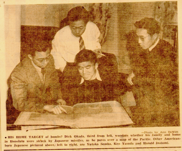 One student, Dick Okada, whose home and family are in Honolulu, was visibly shocked and bewildered. He seemed unable to comprehend that warships of his parents’ country were shelling their nations.
